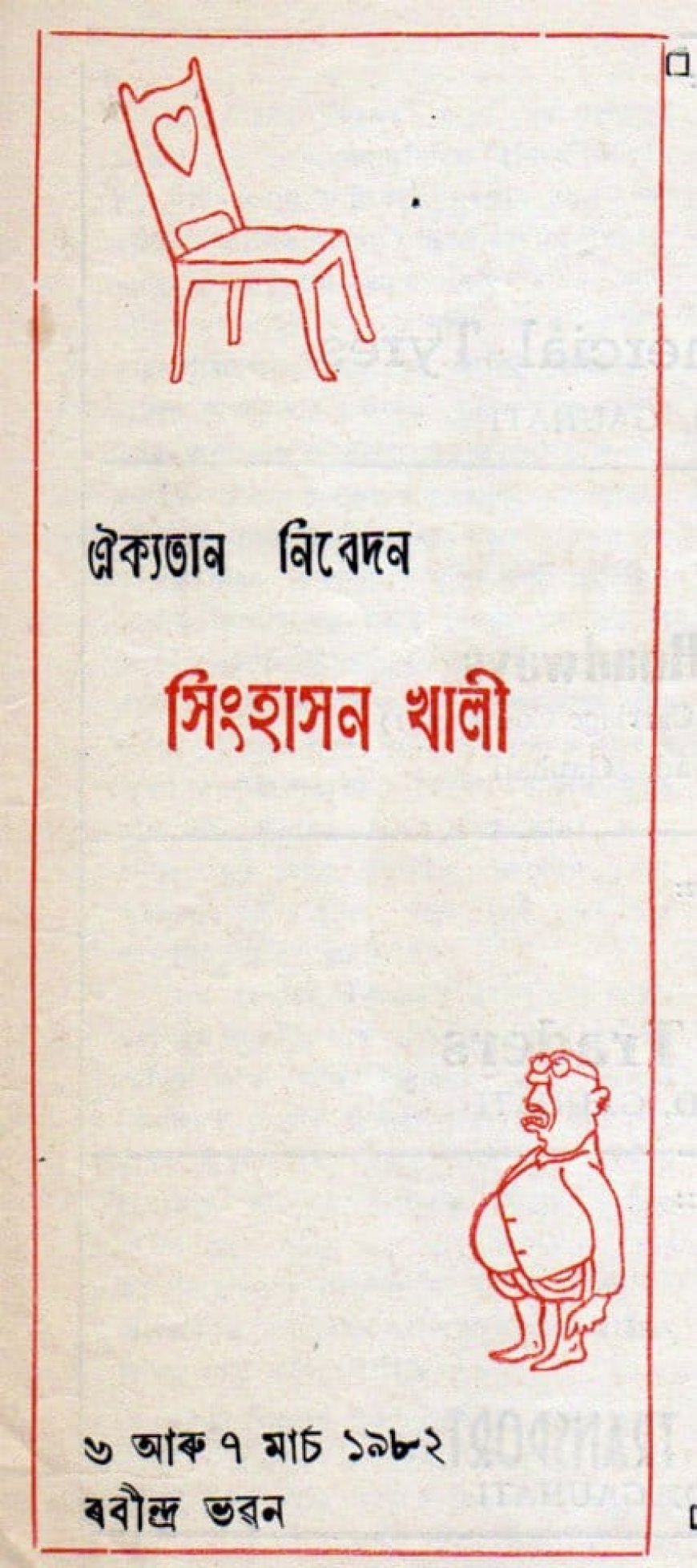 A vacant throne. However, a throne cannot remain vacant indefinitely. It requires a worthy individual to occupy it. An individual who wholeheartedly believes in the ideals of truth, non-violence, and justice is the one deemed worthy. Yet, a worthy person is still nowhere to be found. The greed for the throne, the lust for power, has blurred the line between the worthy and the unworthy. Conflicts occur frequently, leading to conspiracy, struggle, and even murder. In the early 1980s, Aikyatan showcased ‘Sinhashan Khali’, an Assamese version of Sushil Kumar Singha’s original Hindi play. The adaptation and direction were handled by Krishnamurti Hazarika.